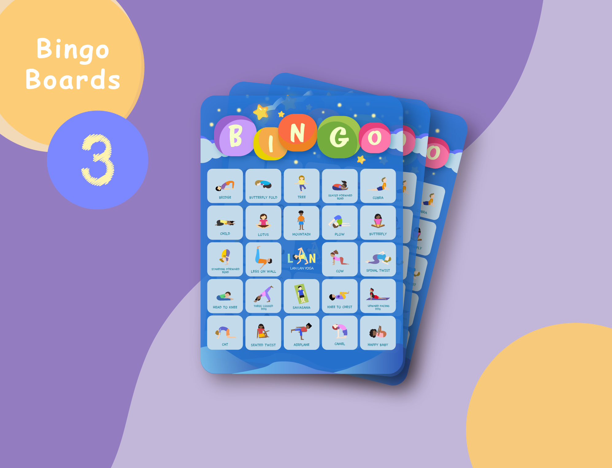 YOGA BINGO: Relaxing & Restoring is a yoga-inspired game to bring joy and inner peace to children of all ages. We carefully selected 24 poses which are appropriate for children to practice, with the benefit of restoring and relaxing.